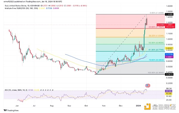在找到 0.36 美元价格区域的支撑后,SUI 价格上涨约 300%,于 1 月 15 日创下波动高点 1.4486 美元。