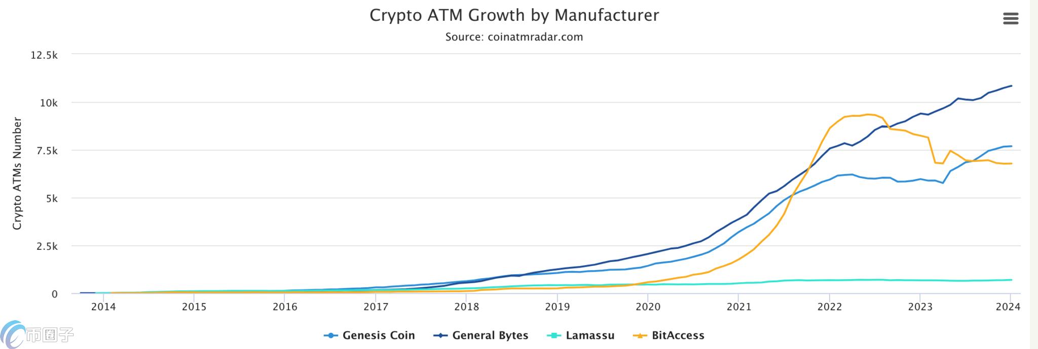 相较之下,市场份额超过BitAccess的两家制造商—General Bytes(占32.2%)和GenesisCoin(占22.8%)—则持续增加其比特币ATM的数量。这表明市场在制造商之间存在不均衡的竞争格局,部分制造商在市场变化中仍保持增长。