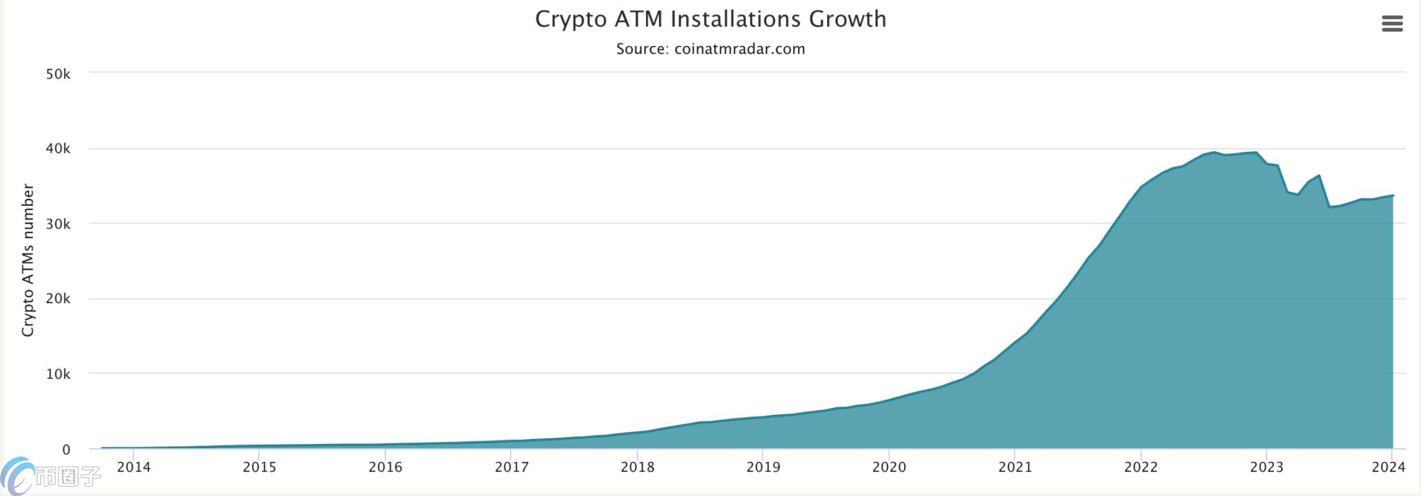趣币网(Qukaixin.cn):近十年来,全球安装的比特币和加密货币自动提款机(ATM)数量一直在稳步增长,并在2022年8月达到历史新高39,376台,但随后就出现了逆转。根据Coin ATM Radar的数据,比特币ATM终于在去年8月开始小幅稳步增长,截至昨(1)日,全球ATM的总数成长至33,628台。然而,与2023年初的37,827台相比,仍减少了大约11.1%。