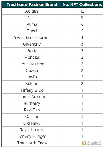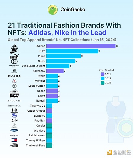 截至 2024 年 1 月 15 日,全球**传统时尚品牌按市值、NFT 系列总数排名如下: