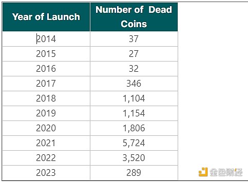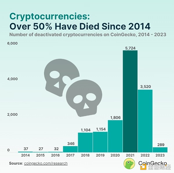 2023 年 CoinGecko 上市的 289 种加密货币消亡。 这意味着失败率<10%,上市的加密货币超过 4,000 种,较往年大幅下降。