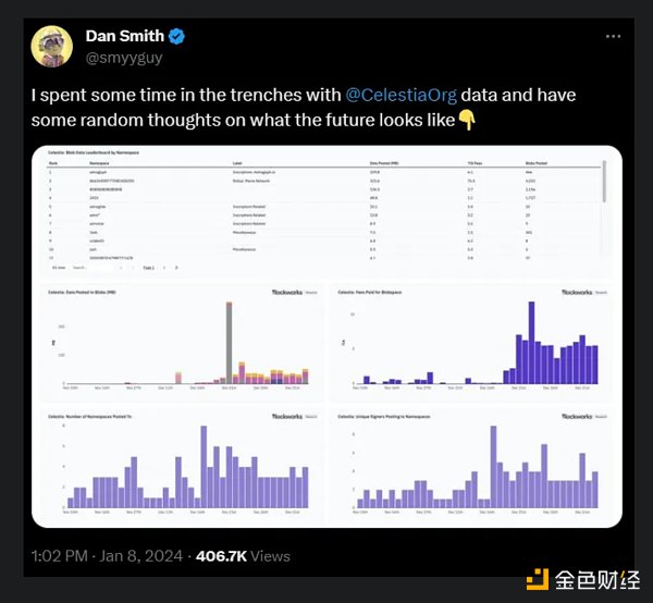 随着这种基础设施的改进,今年可能会有数十个甚至数百个模块化区块链启动。Co**os 上构建的数据可用性层 Celestia 将是这一扩张的主要受益者之一。来自 Blockworks Research 的 Dan Smith 概述了 Celestia 的未来可能是什么样的: