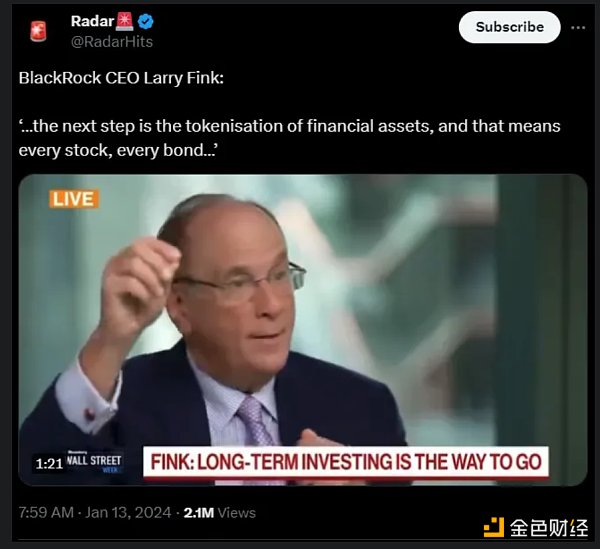 在本周的采访中,贝莱德**执行官拉里·芬克(Larry Fink)多次赞扬加密货币和**化的其他实用工具。在一次采访中,他谈到了未来所有金融资产将如何被**化,以及这个资产所有权的全球分类账可以用于股东投票等事情: