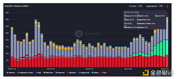 稳定币转账是加密货币在现实世界中**的用途之一,并且一直在增长。本周稳定币整体转账量创下一年新高。这一增长主要是由 Solana 推动的,自 12 月初以来,Solana 一直处于上升趋势。