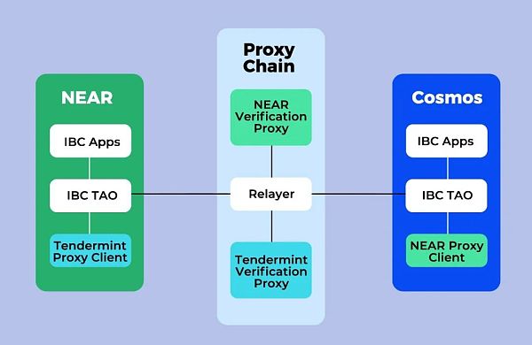 以 NEAR-IBC 为例:在代理链/ Proxy Chain 上部署了 Co**os 和 NEAR 的验证代理,维护对应链的共识,然后在跨链双方再部署一个对方共识机制的代理客户端,替换 IBC 原来的轻客户端。