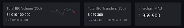 截至2024年1月15日,IBC 协议已经在107个区块链上启动,过去30天总交易量 $40 亿,安全跨链交互800 万次。当然,目前绝大多数跨链发生在 Co**os SDK 区块链之间。