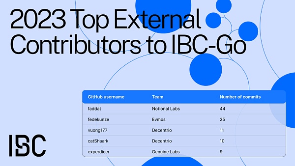 去年,ibc-go 的生命周期中拥有了 52 个外部贡献者,然而到2023年这个数字增加到了 80,实现了显著的53%的增长。以下的表格显示了截至 2023 年 11 月 27 日,ibc-go 的前 5 位外部贡献者在提交次数上的表现。Interchain 的 IBC 团队对这些人以及所有 IBC 贡献者表示最深的感谢,他们的无私贡献将 IBC 的发展推进了一大步。
