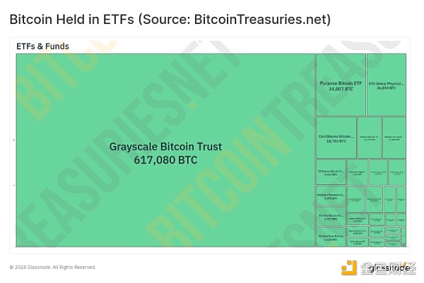GBTC 相对于其他 ETF 产品的**规模可以从 bitcointreasuries.net 的下图看出。 尽管 GBTC 出现流出,但他们持有的 617,080 BTC 的巨额份额令竞争对手相形见绌,而且相关的流动性状况对于**对流动性和深度敏感的交易者和投资者来说仍然具有吸引力。