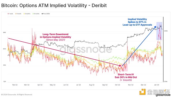 这种下降趋势似乎在短期内发生了逆转,IV 自 10 月份约 30% 的低点以来增加了两倍多,本周达到 97% 以上。 随着现货 ETF 产品为机构和零售资本打开新的大门,比特币的波动性很可能也将开始演变。