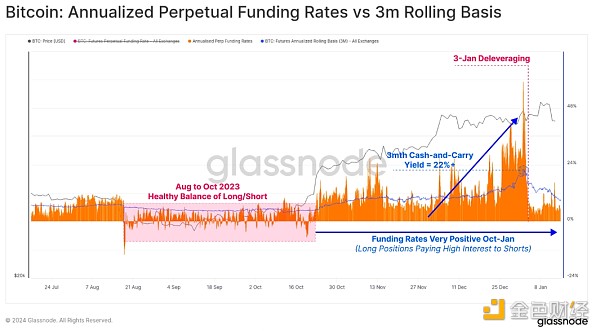 我们可以看到,在1月3日发生了一次重大的去杠杆事件,几乎有15亿美元的未平仓合约在一天内被清算。相反,在1月9日至11日之间,随着ETF猜测达到**,价格接近49,000美元,未平仓合约大幅增加。