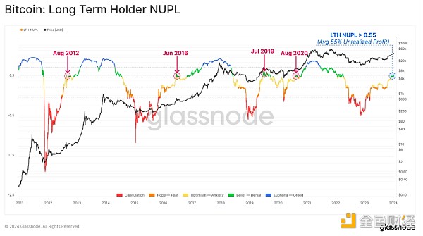 这些长期持有者持有的未实现损益程度可以通过 LTH-NUPL 来衡量。 该指标本周达到了 0.55,这是一个有意义的正数,使长期投资者的平均未实现利润达到 55%。