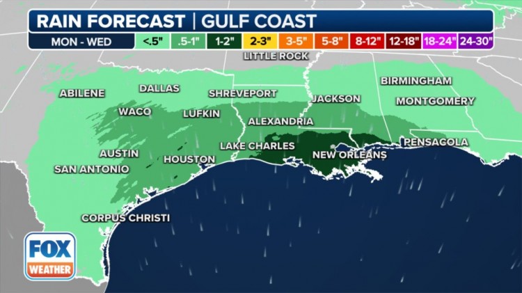 周一至周三,从德克萨斯州休斯顿到佛罗里达州彭萨科拉,大雨将主导这种天气格局。