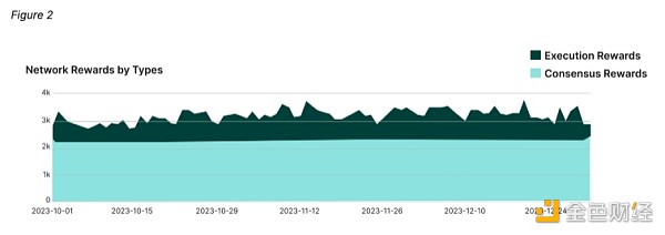 由于以太坊从工作量证明转向权益证明,验证者同时获得共识层(CL)和执行层(EL)奖励。 CL 奖励占第四季度奖励的大部分,约为 75%,而 EL 奖励约为 25%。