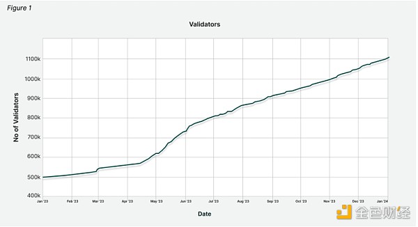 自合并以来的几个月里,随着越来越多的持有者抵押至少 32 ETH,抵押数量稳步增加。 根据 BeaconScan 的数据,截至 2023 年 12 月,质押锁定的总价值已从 2023 年 1 月 1 日的 495,000 名验证者增加到超过 800,000 名验证者,相当于 ETH 总供应量的 23% 以上。