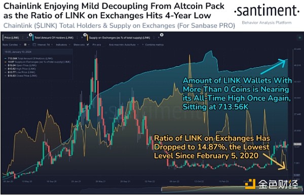 与此同时,持有超过 0 LINK 的钱包数量增加了 6%,“再次接近历史**点,达到 713,560 个”,加密数据情报机构 Santiment 在 1 月 15 日在 X 上发布的帖子中表示。