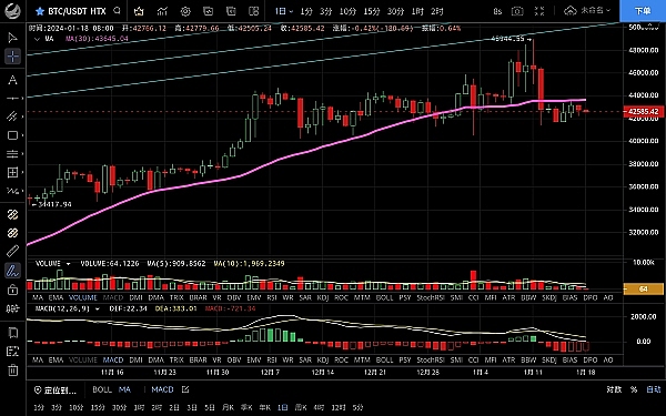 大饼昨日走势如思路一致,整体呈震荡下行走势,**跌至42210一线支撑反弹,恭喜跟上思路的朋友,目前币价在42620附近运行,四小时级别行情跌破42500支撑后向下缓冲一段,k线收针有阴转阳走出反弹,但力度不大,macd多头逐步缩量双线粘合状态,短期走势活动空间逐渐变窄,走势没什么变化震荡为主,日线级别再次试探ma200可见支撑力度较强,k线收阴反弹力度不大整体走势偏弱,加上幅图指标呈死叉,ma7向下指引,日内空头占优势,4w是多空分界线,有下跌试探支撑的可能,思路建议反弹高空为主低多为辅,上方压制43000-43500,下方支撑42000-41500