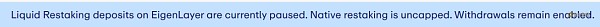 翻译:EigenLayer上的LST目前处于暂停状态。本机重启没有上限。取款仍然有效。