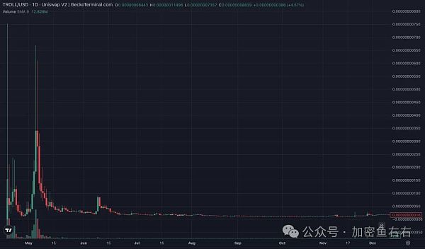 更为有趣的是,TROLL 的上涨是阴差阳错。该**并非近日才应运而生的马斯克概念 meme 币,而是早在 2023 年 4 月就已部署。在马斯克成为**巨魔官之前,该**价格早已从**点跌去 98% 。这是一款名副其实的“归零币”。