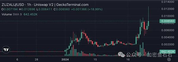 GeckoTerminal 数据显示,在 1 月 14 日之前,其价格仅为 0.000008 美元一枚,而近日**涨至 0.012 美元,**涨幅 1500 倍。即使是以现价计算,涨幅仍然超过了 1000 倍。