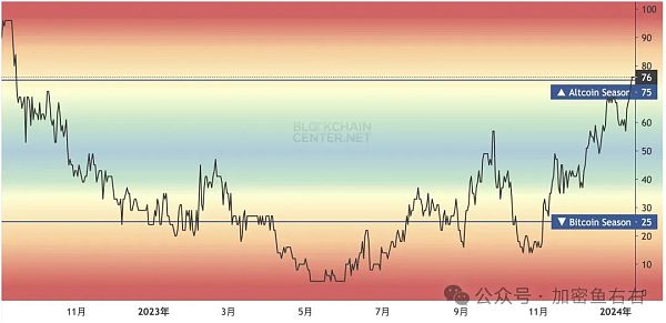 目前,市场已经**进入 meme 狂热季。Blockchaincenter.net 年的山寨季指数显示,当前山寨季指数高达 76 。该指标表明,在过去 90 天内,前 50 种山寨币中有 75% 的币种表现优于比特币。