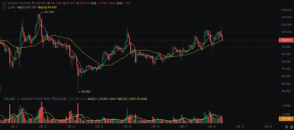 10 日移动平均线 99.13 美元与Solana (SOL)当前价格范围的接近表明短期趋势相对稳定,而 100 日移动平均线 96.18 美元表明长期趋势类似。