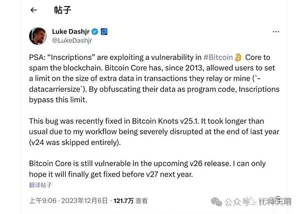 争论的起因,源于一则来自BitcoinCore开发者LukeDashjr的推文:
