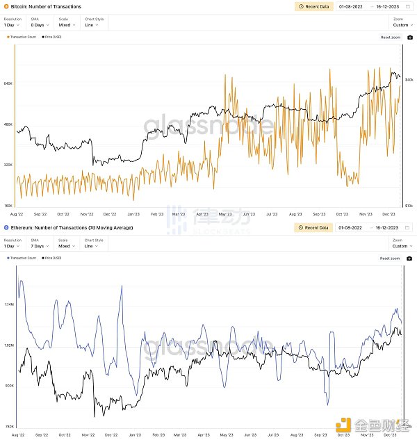而通过比特币与以太坊网络在同一时期的交易笔数对比图可以看出,2023 年下半年,比特币网络的活跃程度要明显高于以太坊,因此专注于以太坊生态的 MetaMask 并没有吃到红利获得流量增长。