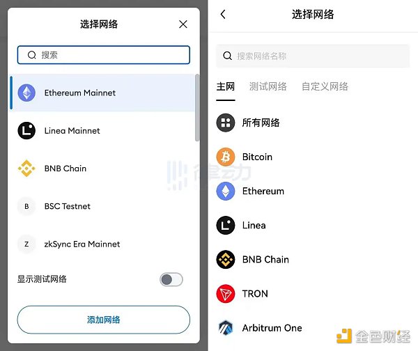 除了手机端,OKX Web3 钱包的插件端从 UI 界面可以看出,与 MetaMask 钱包相比 OKX Web3 钱包提供了更多细节方面的改善。比如在钱包「选择网络」版块,左侧 MetaMask 需要手动添加,右侧 OKX Web3 钱包显示支持的所有网络,并提供「所有网络」选项可供用户查看账户**资产。而在币种展示界面,OKX Web3 钱包除了显示数量和余额外,还会显示币种当前价格和涨跌幅。