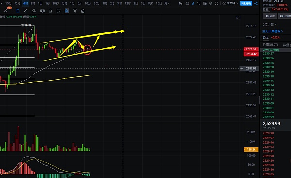 4小时线上看,以太的走势跟大饼类似,也是下跌到昨日预测目标区间后收两根下影线,短线走势也是小幅的上升通道中,白盘的收线刚好在通道底部,日内反弹问题不是很大,预计到达点位在2590-2640,到达2640附近收收针行情也就将再度回到震荡走势,近期大家交易上就等待行情走出破位,交易上控制好风险,日内交易自行把握进场机会;短线交易,控制风险,盈亏自理;