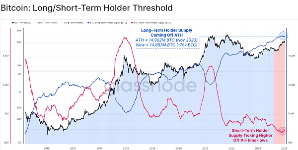 长期持有者似乎正在**风险并获利了结,比特币持有量从2023年11月创下的历史**点减少75000个。交易量的下降加上短期持有者的增加,可能会导致比特币价格持续下跌。