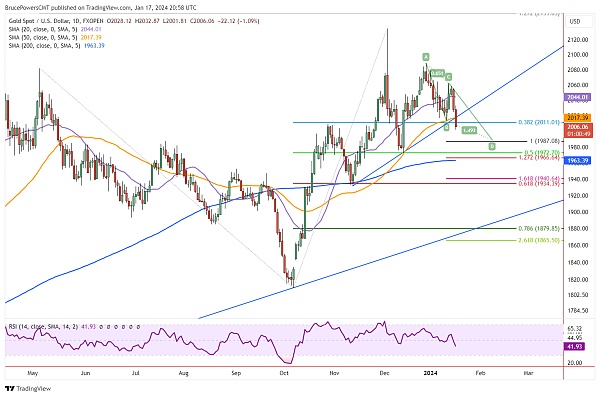 如果从近期波动高点2088美元(A)开始的当前调整**只下跌了**,那么接下来应该会恢复更大的牛市趋势。市场现在看到,自上周五高点(C)以来的第二次下跌趋势仍在继续。