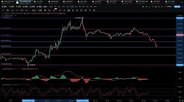以太昨日给出的策略2600附近做空,看2500附近,行情基本走出预测,拿到丰厚利润。行情跌下来之后并没有反弹,现阶段还是2500附近震荡,日线指标MACD和KDJ处于顶背离,后市继续看空,建议2520—2540附近空,目标2450—2400.