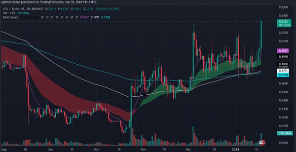 值得注意的是,CFX 的表现甚至超过了行业巨头比特币和以太坊,这证明了其强劲的增长和潜力。该**目前位于 200 天简单移动平均线之上,表明其持续的积极势头。