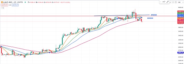然后我们再来看一下比特币的日线级别 因为目前价格已经是跌破了这一条紫色的60ma 那我们尽量观察 支撑位就取整数关口 40000这边到底能不能守住 守不住的话有可能上去就会是陷阱