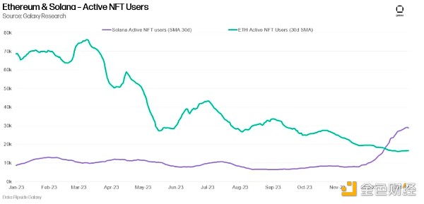 在2023年,活跃的以太坊NFT用户数量下降了73%,而Solana的活跃NFT用户数量增加了超过80%。NFT用户是指在单一天内铸造、购买、出售或转移NFT的**地址。