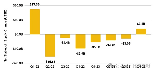 稳定币供应量是衡量在**给定时间点可随时用于投资加密资产的资本量的指标,从而表明潜在的购买压力。自2022年**季度以来,市值排名前五位的稳定币供应量的季度净变化在2023年第四季度**转为正数。未来几个月值得关注这一指标,看看这种变化是否会影响市场。暂时的或代表更持续的上升趋势。