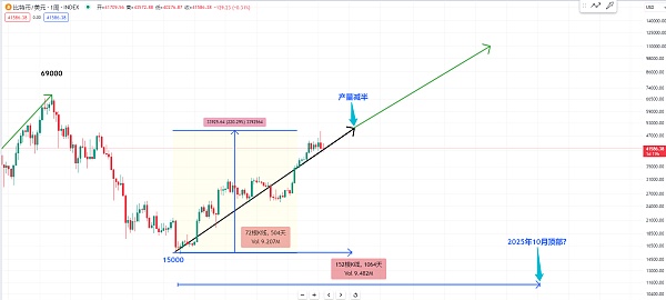 我们可以观察一下比特币自从15000开始 或者是这一条黑色的线 这个中间分出来的位置就是比特币产量减半的时间 所以有可能上半场的上涨就是他在产量减半之前比特币有可能就会提前一年触底