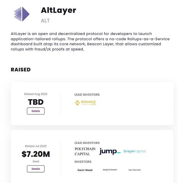 2022年7月,AltLayer完成720万种子轮融资,Polychain、Jump Crypto 和Breyer CaPital领投,波卡创始人Gavin、前Coinbase**技术官和前a16z合伙人等行业大佬参投。