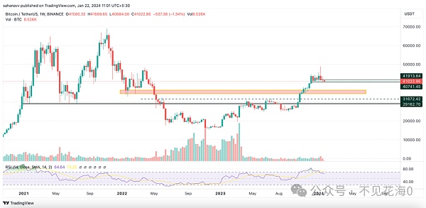 比特币的周线图显示,价格目前徘徊在主要的阻力位和支撑位之间,分别为41,913美元和40,741美元。在支撑方面,40,000美元是强支撑,37,000美元是**道防线,30,000美元是第二道防线。由于每周相对强弱指数(RSI)呈下降趋势,预计将会有更多的价格调整。尽管成交量继续保持在低位,但看跌活动明显着增加。
