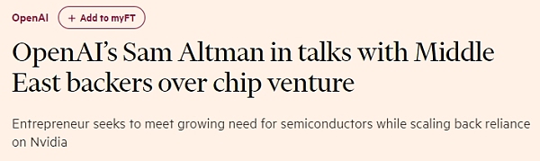 英国《金融时报》报道称,OpenAI**执行官阿尔特曼(Sam Altman)正在与包括台积电(TSMC)在内的中东投资者和芯片制造商,讨论成立一家新的芯片合资企业。他希望能满足公司对半导体日益增长的需求,同时减少对英伟达(NVIDIA)的依赖。