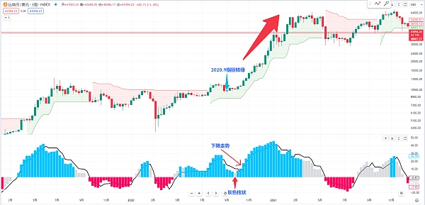 或者我们可以观察一下比特币在2020年的9月份 当时在这边也是超级趋势指标开始转绿 买入的信号出来 每一次有跌回来的位置 我们就去找下方的这个qqe的柱状 他在呈下降的走势 或者是在这根灰色的柱状他跌不下去 那有可能后面就开始呈上升的柱状 后面就是一**牛市