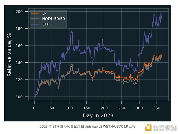 2023 年,ETH 的起价略低于 1200 美元,收盘价接近 2300 美元。这种变动导致了相对较高的发散损失(DL;也称为无常损失)。具体来说,2023 年的 DL 几乎恰好是 5%——也就是说,与 v2 池中的 LP 头寸相比,如果 LP没有收取**费用。