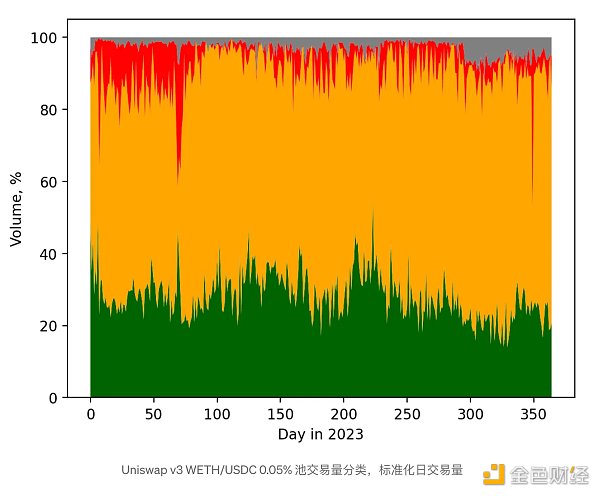 池中至少 63.8% 的交易量来自与 DEX 或聚合器智能合约交互的互换,而只有 28% 到 32% 的交易量来自套利机器人。大约 80% 的 DEX 和聚合器合约量专门与一个 Uniswap 路由器合约进行交互。