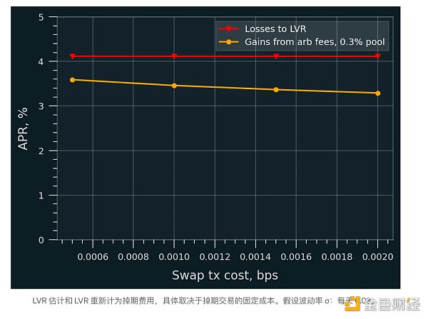 请记住,LVR 是 CEX/DEX 套利者理想条件下的理论**损失。它假设有限合伙人不会从这些交易中赚取**掉期费用,但现实情况并非如此。LVR 的一部分通过掉期费用被 LP 收回,而一些收入则通过固定成本交易 (tx) 费用泄漏到网络中。确切的分布主要取决于两个因素:
