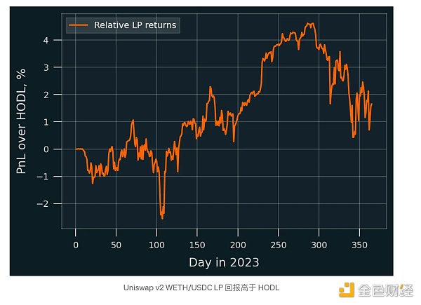 然而,在考虑费用时,LP 回报在一年中的大部分时间都优于 50:50 HODL 策略。下图显示,截至 10 月份,他们的相对利润超过 4%,年底利润在 1% 到 2% 之间。