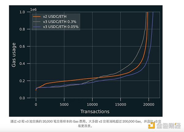 反驳:简单的 USDC/ETH 互换可能会在 v2 上消耗比 v3更多的Gas(如下图),因此 v2 上活动的增加不能仅用 Gas 费来解释。原因之一是价格预言机更新会消耗 v2 池中更多的 Gas。