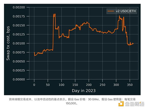 这种摩擦与矿池的流动性深度成反比。因此,用池中锁定值的基点 (bps) 来表达这一点是实用的。v2 WETH/USDC 池锁定了 5000 万至 1 亿美元,即使在 Eth 主网上,相对交易成本也相对较低。使用具有 30 GWei Gas 价格和每笔交易 150,000 Gas 的简单模型,下图显示了以 bps 为单位的成本。