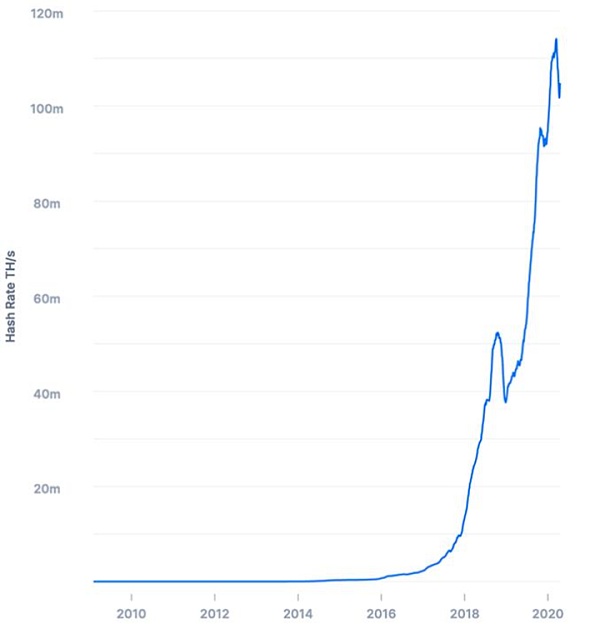 根据比特币每个区块的难度值和产出时间,就可以推算出整个比特币网络的**算力。比特币网络的**算力一直在迅速增加。目前,**算力已经超过了100EH/每秒,也就是大约每秒钟计算1万亿亿次哈希: