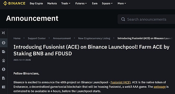 随后的6 月,Fusionist 宣布获得了660 万美元的融资,Binance Labs 和FunPlus 领投。12 月,Fusionist 专案**ACE 先后上线okX Jumpstart 和币安新币挖矿版块,吸引了大量投资者的参与。
