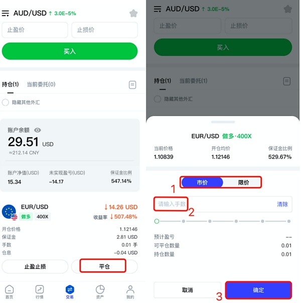 3.查看订单。成功下单后,可在APP下端持仓栏下查看开仓价格、保证金、手数、仓息以及账户情况和保证金比例。当盈利达到您的预期时,可点击【平仓】。